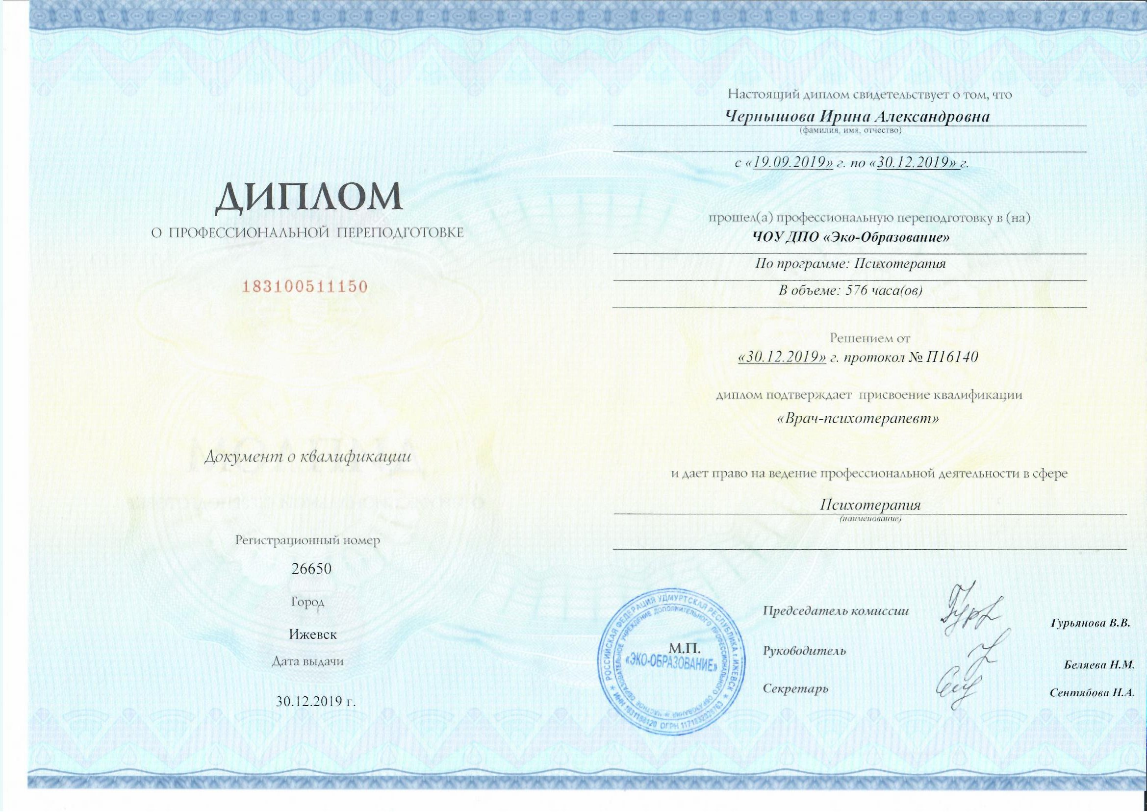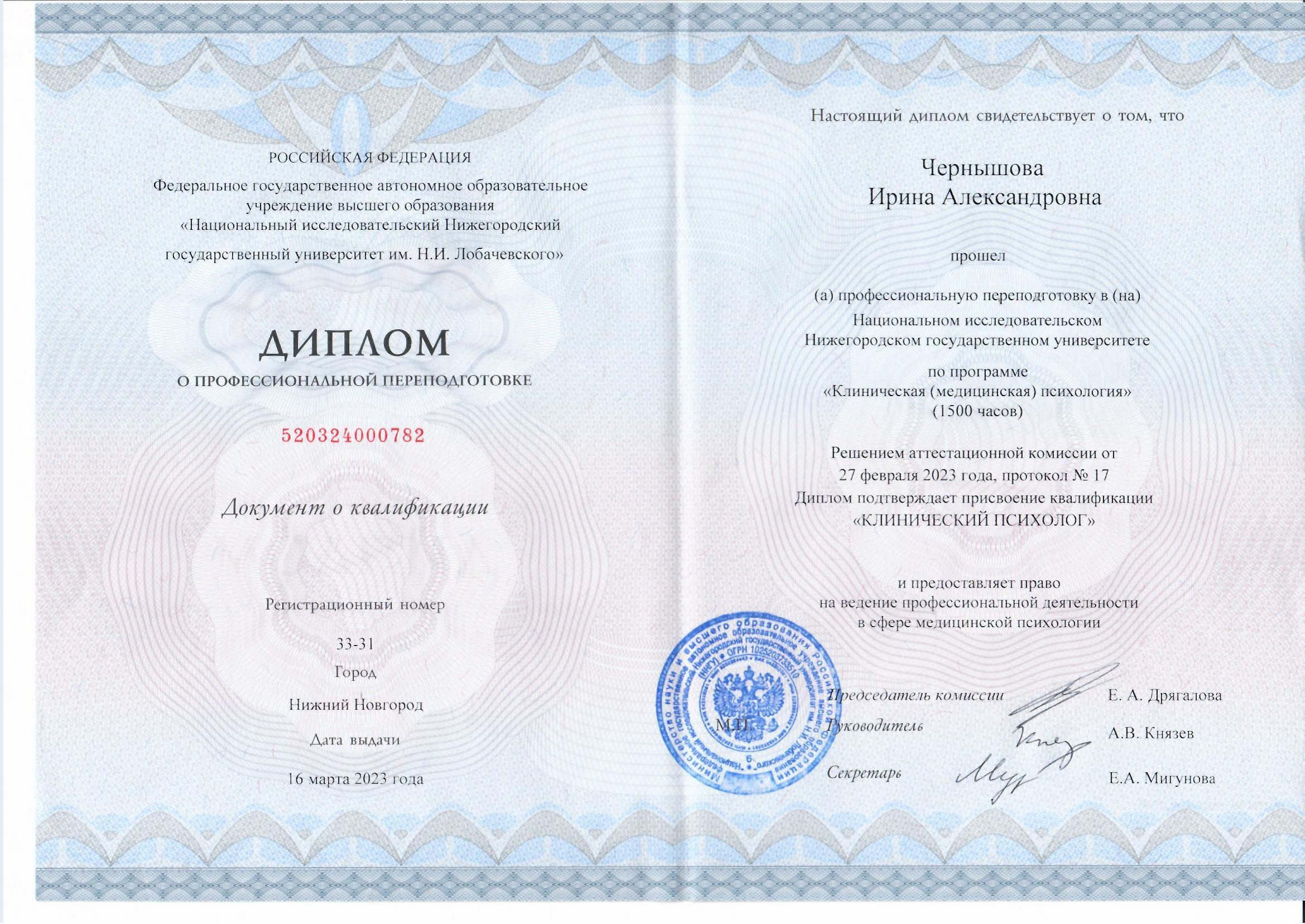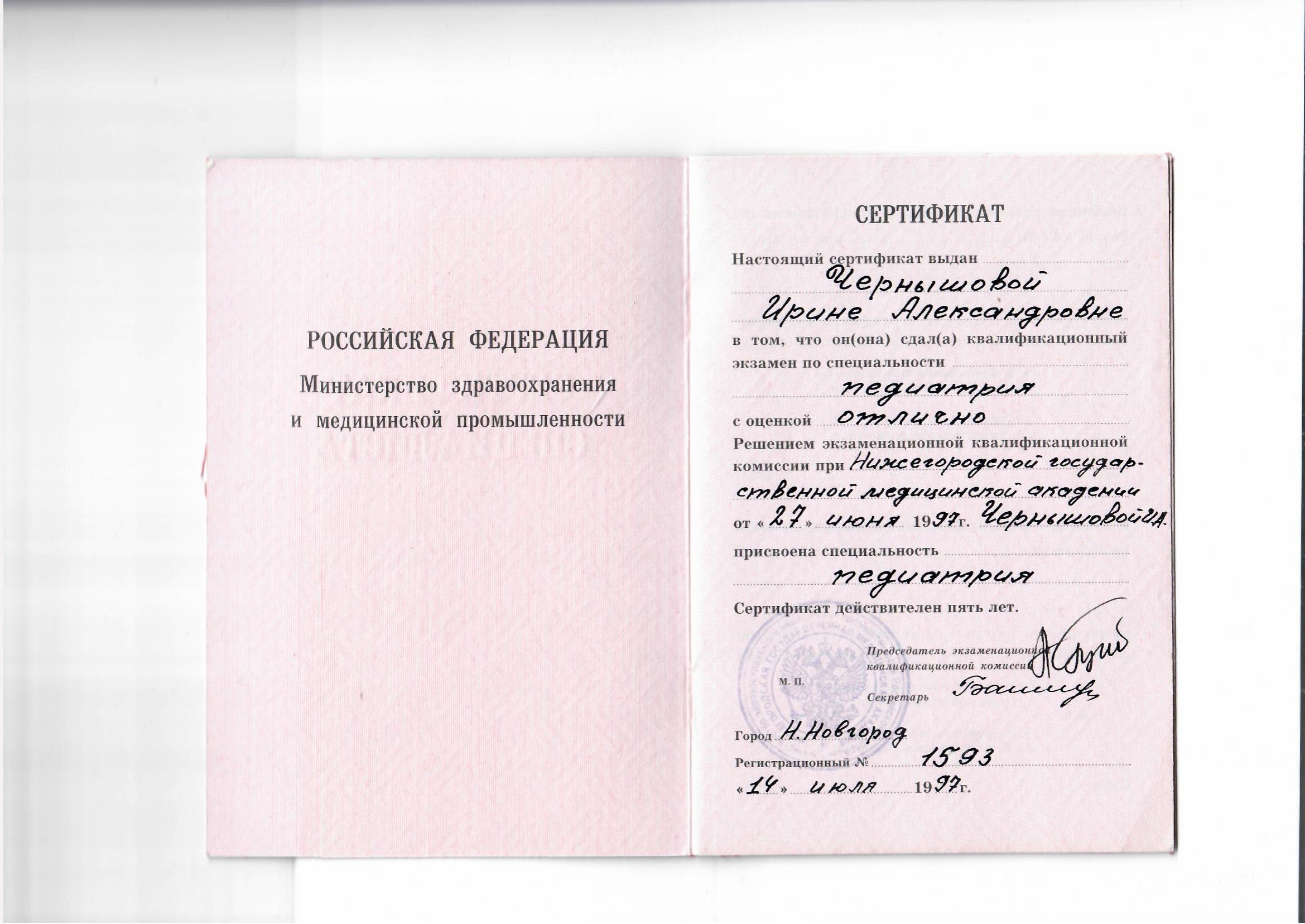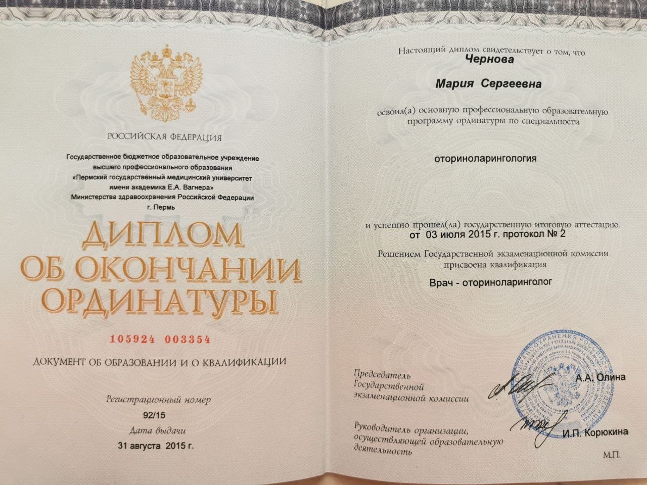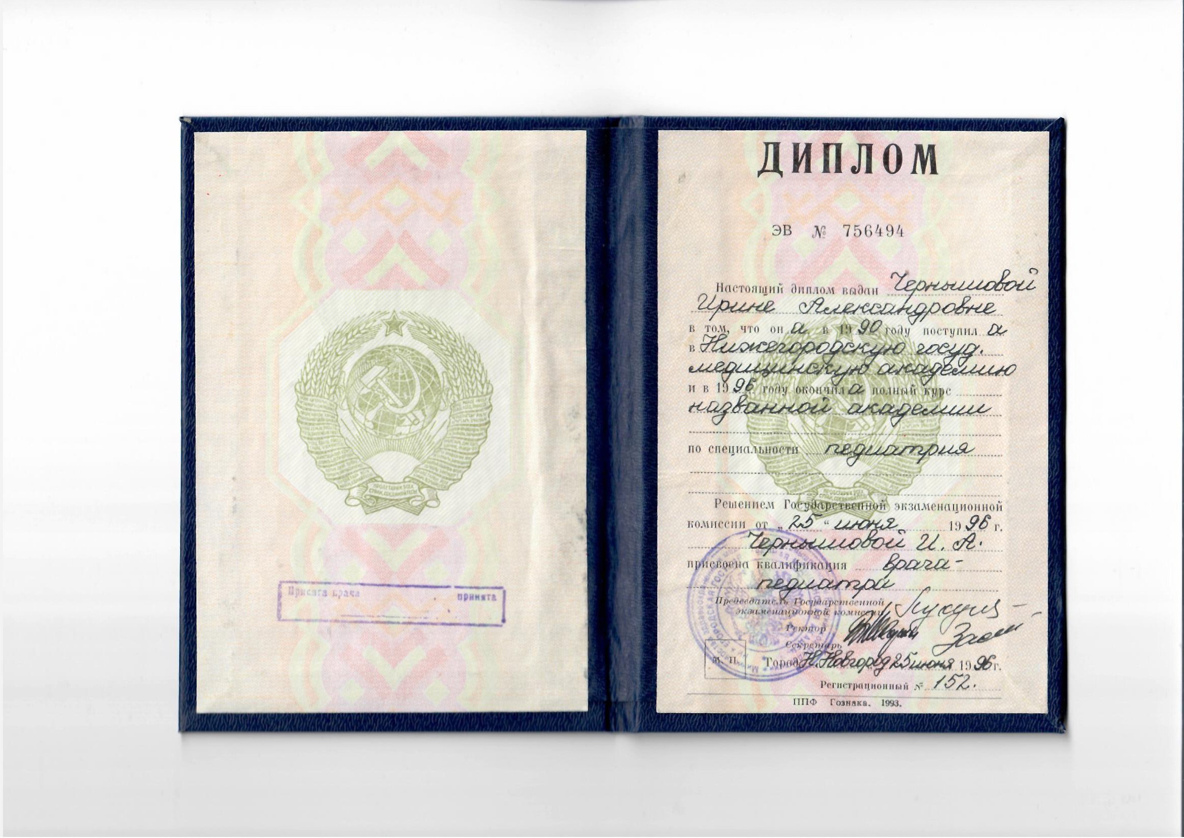 – сентябрь 2011г — июнь 2017 г — Нижегородская государственная медицинская академия, факультет педиатрический, диплом специалиста (дневное отделение), свидетельство о прохождении аккредитации по специальности врач участковый-педиатр.