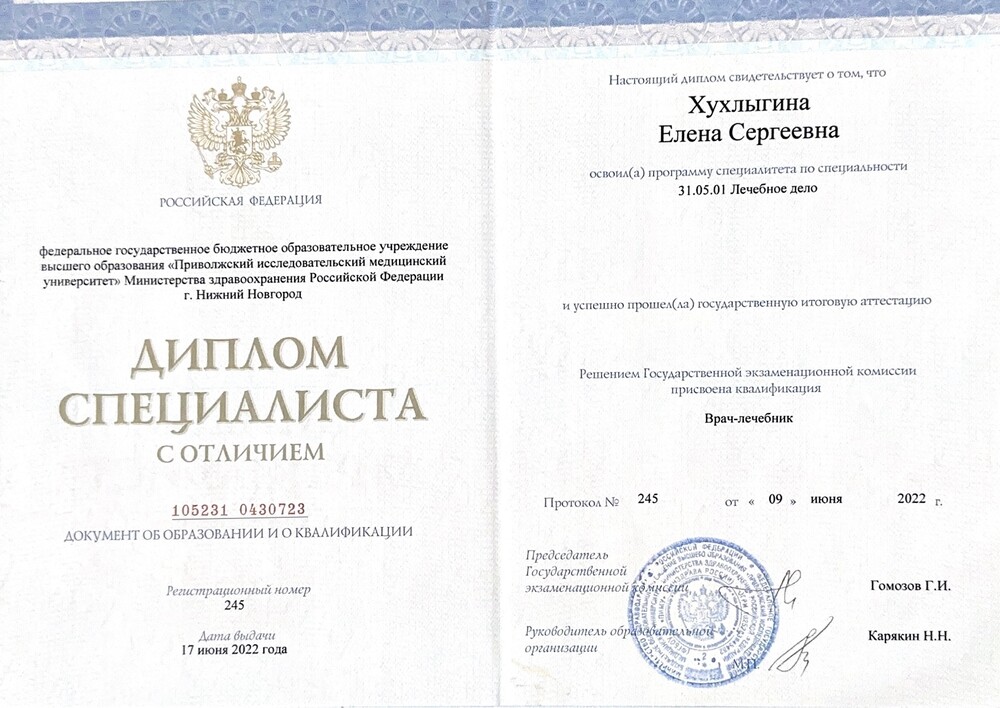 2022 г – ФГБОУ ВО «ПИМУ» МЗ РФ, врач-лечебник