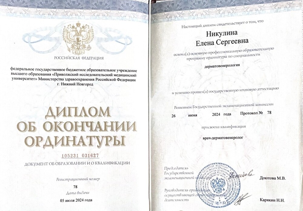 2022 – 2024гг. – ординатура по специальности «дерматовенерология», ФГБОУ ВО “ПИМУ” МЗ РФ, врач дерматовенеролог